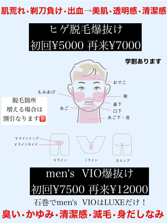 誰にも言えないデリケートゾーン。そして蒸れ、痒み、黒ずみ、毛量の多さ。毛量は調整できます。範囲もご希望のデザインできます。当サロンの脱毛マシンは当初の爆抜けより更に!パワーアップしたマシンを導入致しました。 ヒゲ脱毛とVIOのお客様が大変多くリニューアル致しました。最新機種でごっそり!一回に照射で抜けたのがわかります。他の箇所と同時に脱毛が可能ですのでぜひお問合せください。